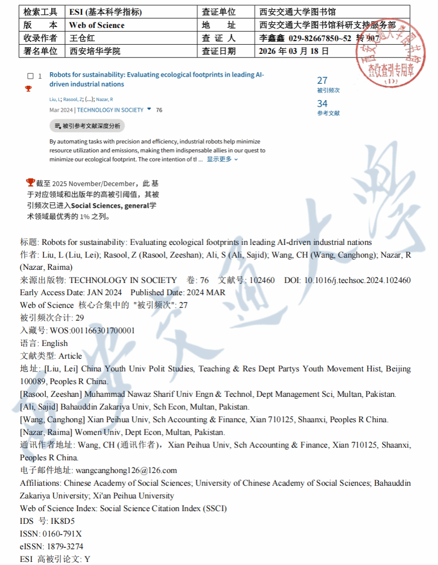 该论文以“Robots for sustainability: Evaluating ecological footprints in leading AI-driven industrial nations”为题,于2024年3月发表于国际顶尖SSCI期刊《Technology in Society》。据悉,该期刊由Elsevier出版,JCR分区为Q1,2025年影响因子达12.5分,在社会问题与跨学科社会科学领域排名稳居前1%,是全球该领域极具影响力的学术平台。