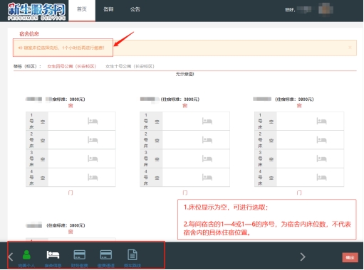 点击“宿舍信息”,新生根据自己需求,可直接选取到宿舍房号;每间宿舍的1—4或1—6的序号,为宿舍内床位数,不代表宿舍内的具体住宿位置,具体床位号到宿舍后随机选择;