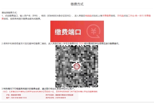 缴费前请仔细阅读招生信息网《西安培华学院2024级新生缴费指南》;请不要向任何人透漏自己缴费信息和缴费通道,由此造成的损失,由本人负责。