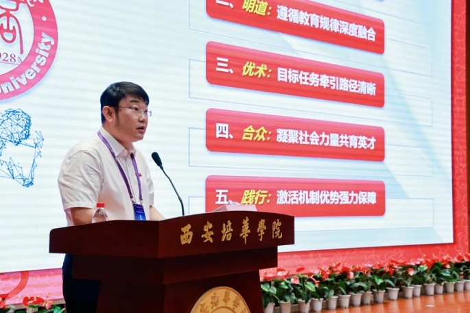 校长助理鲍伟图文并茂地解读《西安培华学院关于深化产教融合,提升应用技术型人才培养质量的指导意见》等系列文件。对以产业学院为抓手的专业集群建设、以专业认证为抓手的专业内涵建设、以校企合作课程为抓手的课程建设做了科学部署。