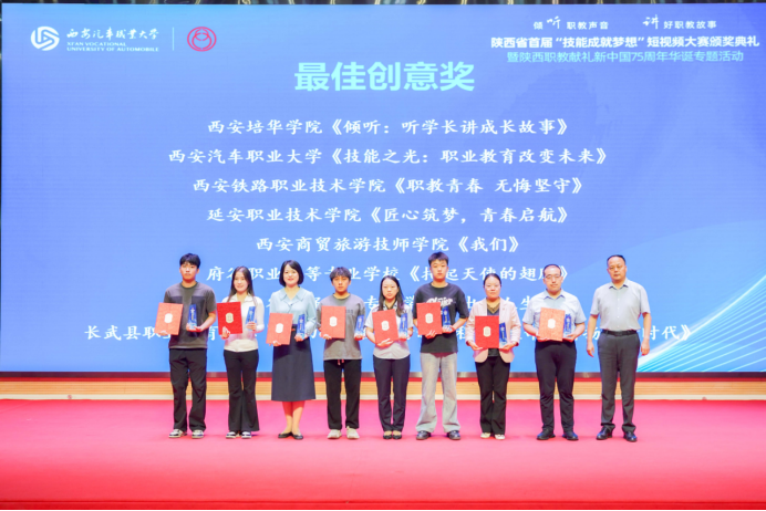 9月27日,由省委统战部指导,省教育厅、省人力资源和社会保障厅、省中华职业教育社和各界导报社主办的陕西省首届“技能成就梦想”短视频大赛颁奖典礼暨陕西职教献礼新中国75周年华诞专题活动在西安汽车职业大学举行。省政协副主席、省中华职业教育社主任李忠民出席并为获奖代表颁奖,省委统战部副部长虞浩桂出席并讲话。