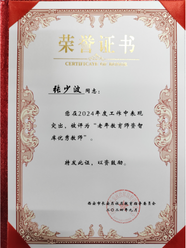 西安培华学院医学院团委副书记张少波老师成功入选西安市教育局第五届西安市老年教育师资智库名单(市教办发〔2024〕65号),并荣获西安市长安区社区教育“老年教育师资智库优秀教师”。