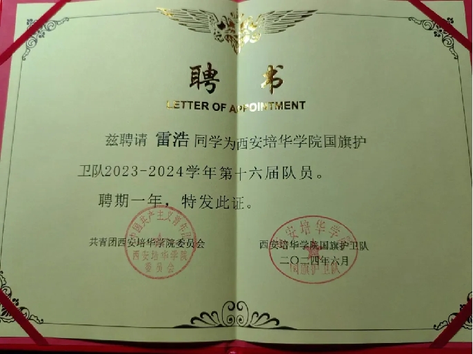 从高原军营到培华校园,他脱下了军装却从未卸下那份对国家和人民的深情厚谊,在学校“百团大战”纳新时,雷浩毅然决然选择加入“国旗护卫队”成为目前学校国旗护卫队中唯一一名退伍军人,继续散发作为军人的那份荣光,新生开学典礼、国家公祭日活动等每一次重大活动的升旗仪式上雷浩挺拔的身影都显得格外引人注目,每当国旗缓缓升起,他都会想起在军营中的日子,那份对国家的热爱和忠诚如同国旗般在心中飘扬。