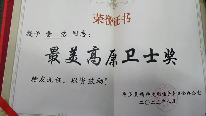 雷浩所在部队先后荣立集体一等功1次、二等功1次、三等功2次,始终坚持用“老高原精神”砥砺官兵思想,引导青年官兵在岗位练兵和评比竞赛中“争上游、当标兵”,在完成急难险重任务中“上一线、打头阵”,强化争做“四有”新一代革命军人的实践要求,在见红旗就扛、见第一就争的创优氛围下雷浩荣获“最美高原卫士”称号,退役时收获中央军委政治工作部授予的“卫国戍边三级纪念章”,每一次嘉奖都是对雷浩最真切、最坚实的肯定。