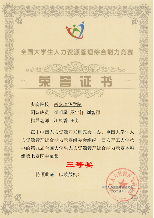 近日,备受瞩目的第九届全国大学生人力资源管理综合能力大赛西北赛区的比赛落下帷幕。培华学子崔明星、罗宇轩、刘智郡团队凭借扎实的专业知识、出色的团队协作能力,在此次大赛中获三等奖。