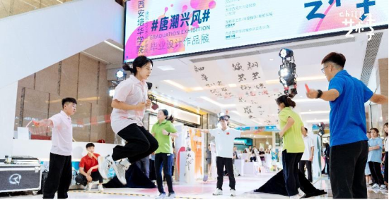 在唐潮兴风展区现场,西安培华学院体育学院的同学们表演了精彩的花式跳绳,展现了青年学生的青春与活力。