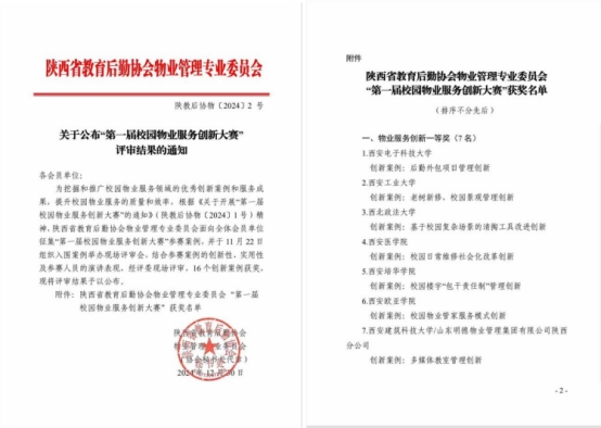 近日,由陕西省教育后勤协会物业管理专业委员会主办的“第一届校园物业服务创新大赛”公布比赛结果。学校后勤服务中心报送的“以心驭新,勠力同心—楼宇包干责任制夯实校园物业服务新作为”案例获得“物业服务创新一等奖”。