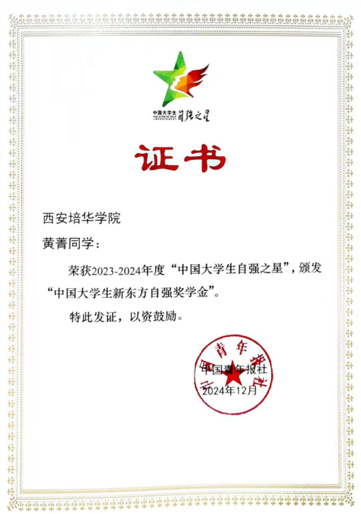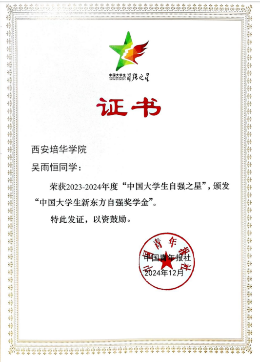 近日,由共青团中央、全国学联指导,团中央基层建设部、中国青年报社主办的2023-2024年度“中国大学生自强之星”奖学金评选结果正式揭晓。经过学校推荐、省级初评、全国评审等环节,西安培华学院的吴雨恒和黄菁两位同学脱颖而出,荣获“中国大学生自强之星”荣誉称号。