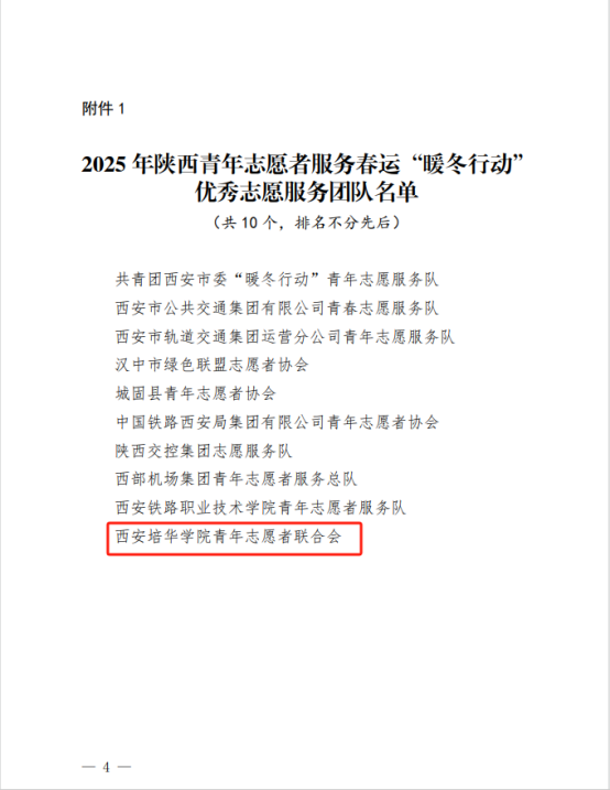 近日,共青团陕西省委公布2025年陕西青年志愿者服务春运“暖冬行动”工作的通报,西安培华学院青年志愿者协会荣获2025年陕西青年志愿者服务春运“暖冬行动”优秀志愿服务团队称号,6名培华学子荣获优秀志愿者称号。