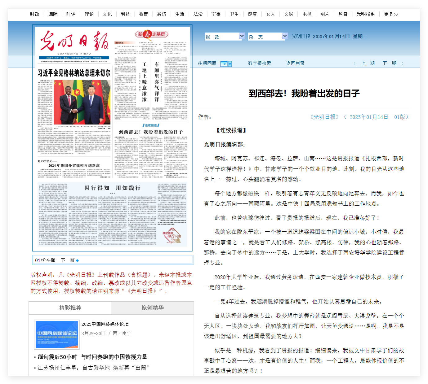 1月14日,光明日报头版刊发该校毕业生投身西部建设的回信