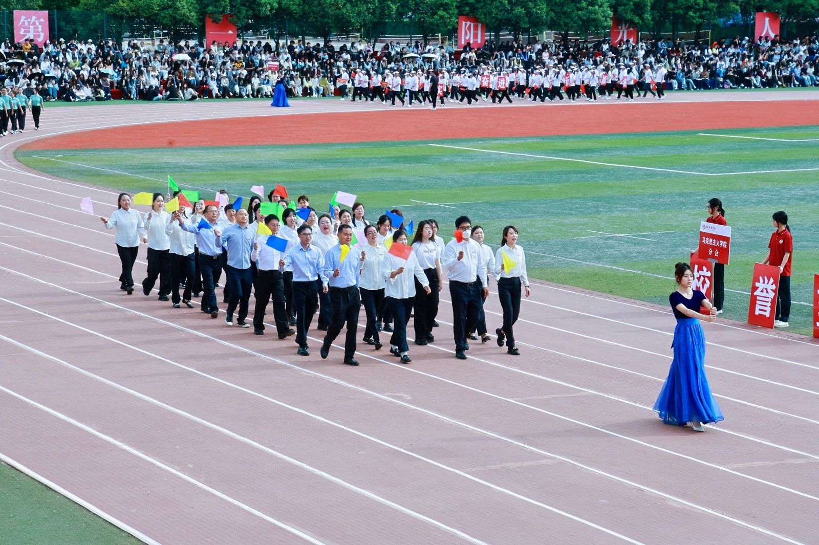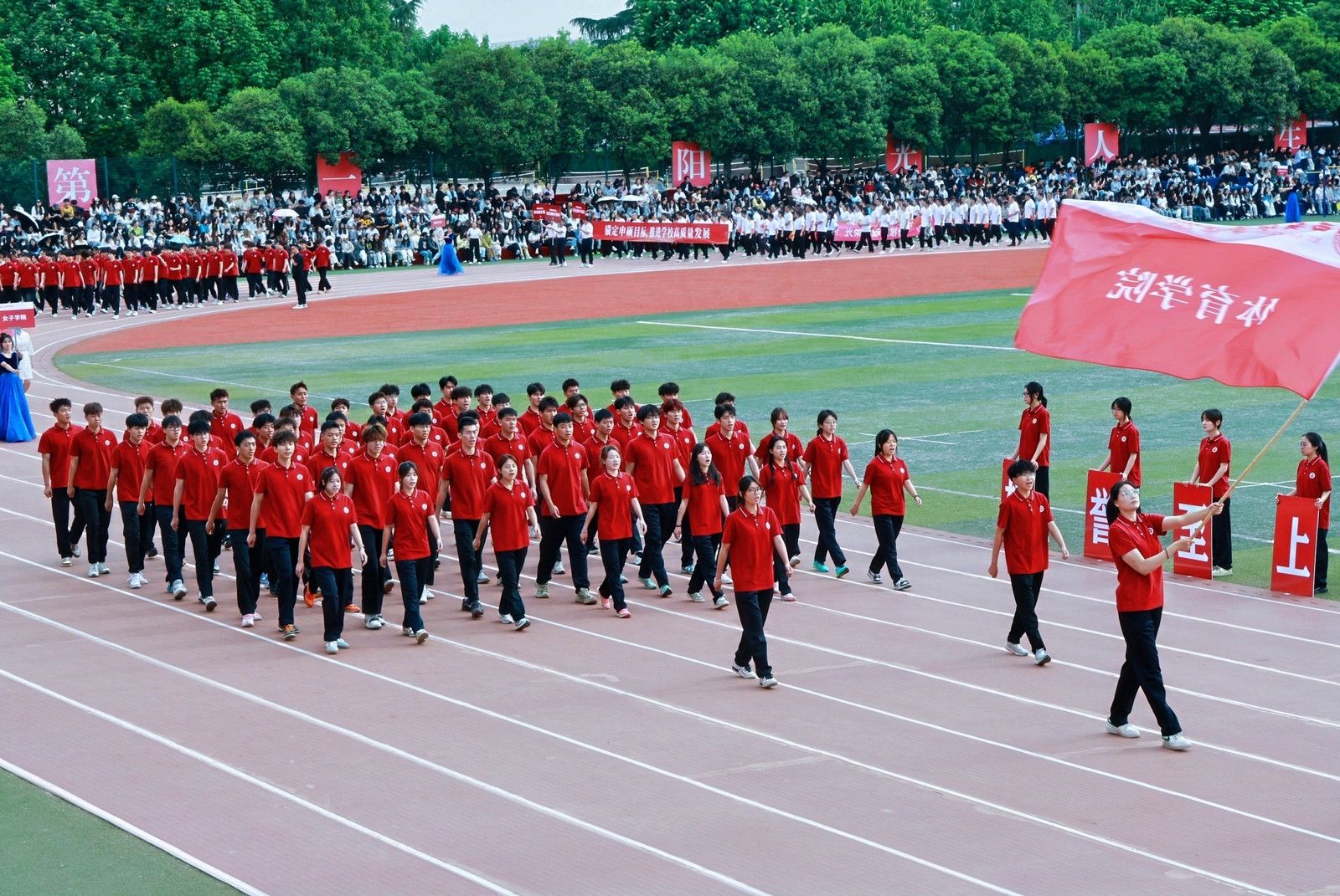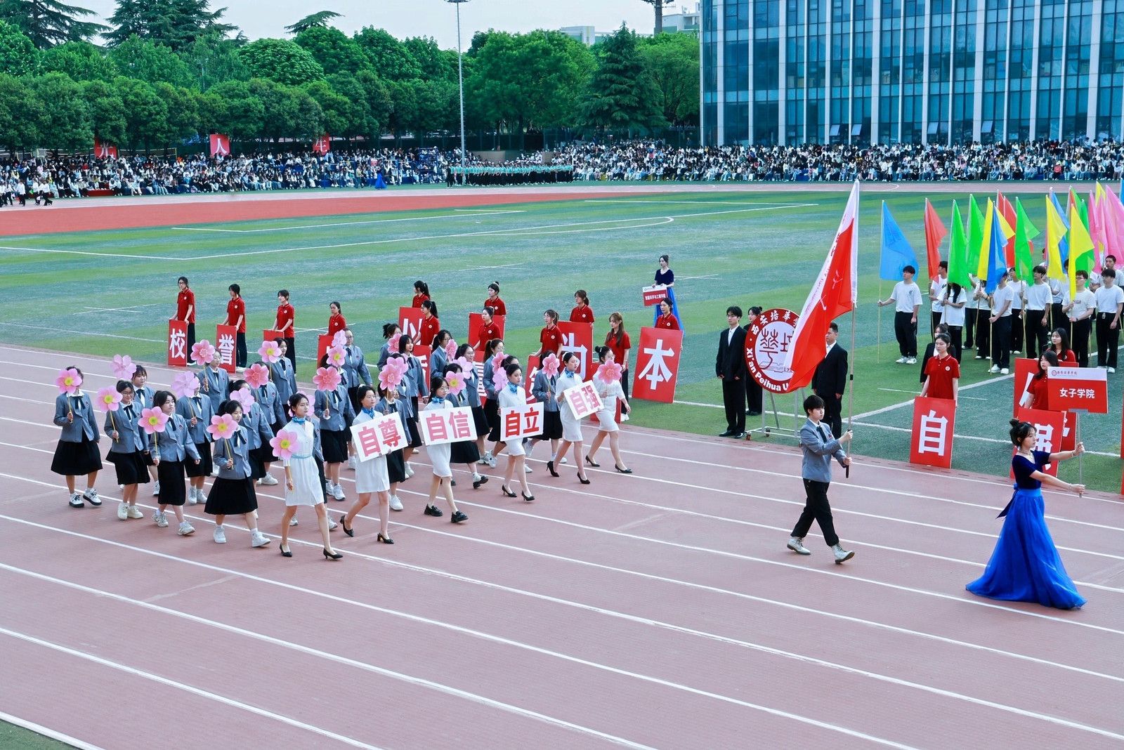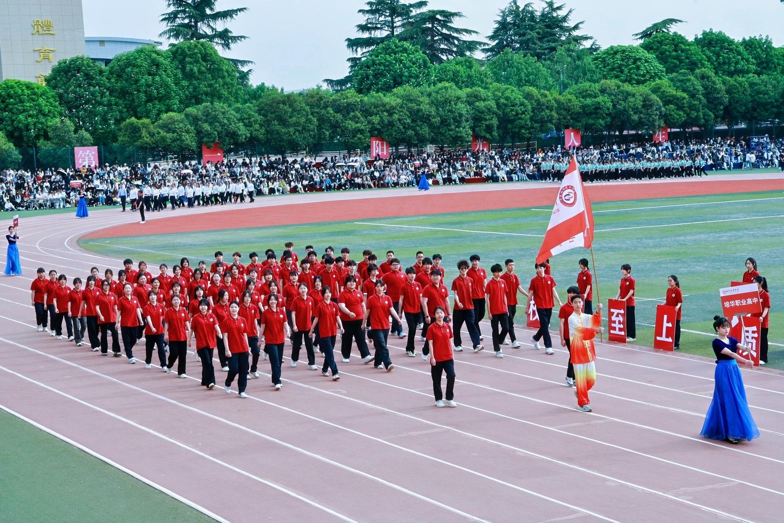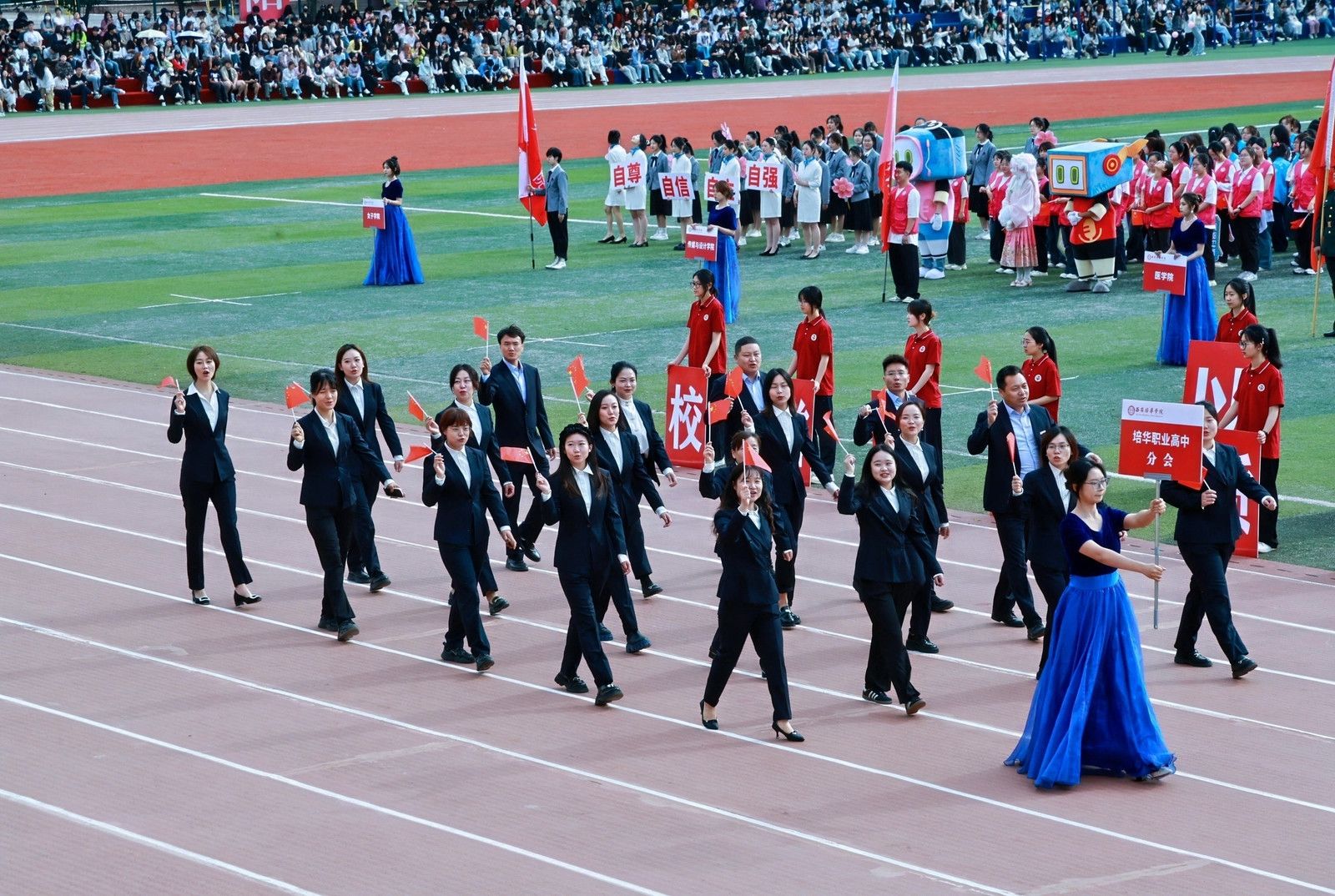 机关教工方阵高举培华,“职业教育、女性教育、红色教育”三大特色基因,锚定申硕目标,推进学校高质量发展,他们展育人者之担当,显奋进者之光芒,从培根铸魂的初心,到师生同心的凝聚,从百载峥嵘的积淀,到年华璀璨的绽放,他们以智慧为舟,以奉献为桨,在教育的星河中领航。