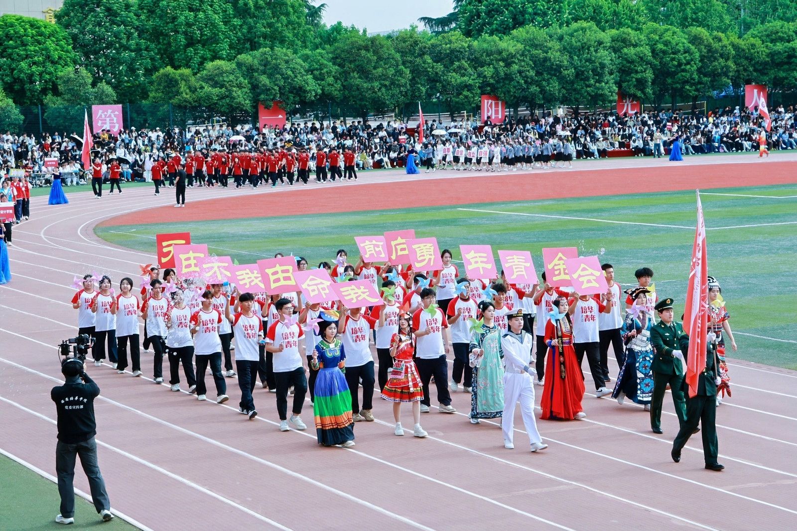 会计与金融学院学子,用民族与神话共舞多元风采,传媒与设计学院学子,执光影为翼转动时代的脉搏,体育学院学子脚步铿锵,目光如炬,浇筑“强国有我”的铮铮誓言!女子学院学子以优雅书写,“巾帼不让须眉”的当代注脚。