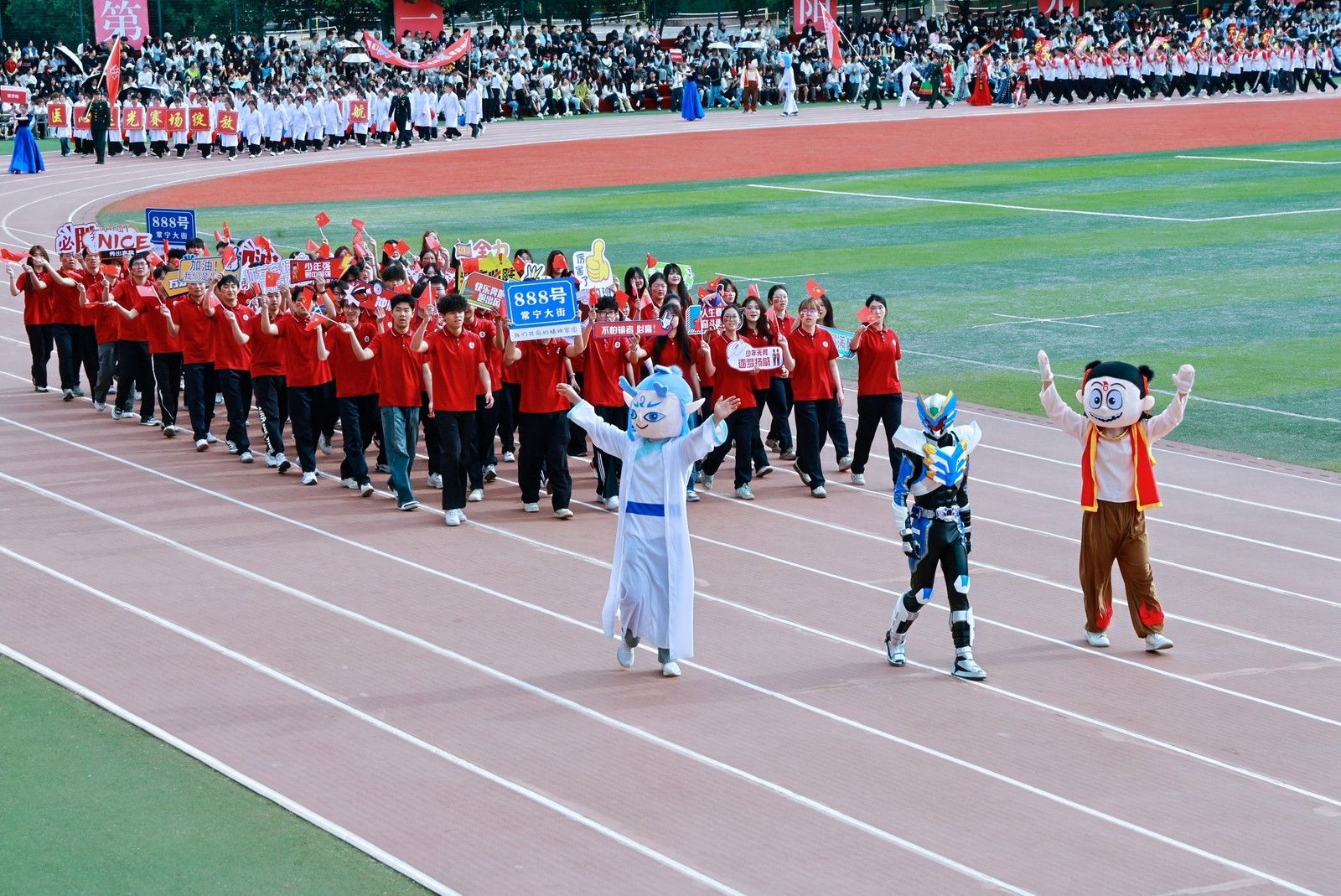 教职工方队化身粉色浪潮,144双手共绘樱花海,老师们秒变追风舞者,团队协作默契满分,欢笑与汗水交织成最萌年龄差表演。