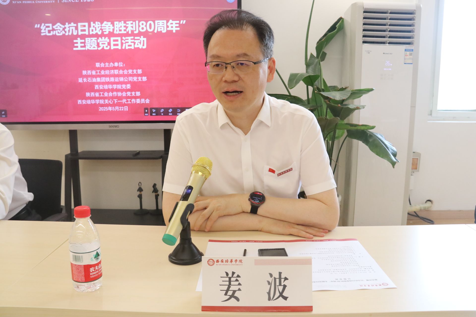 西安培华学院理事长姜波致欢迎词,他表示,培华作为一所具有深厚红色文化底蕴的高校,始终致力于传承和弘扬红色文化,深学笃行强党性,薪火相传育新人,通过丰富的思政教育实践,将红色基因融入人才培养全过程。他希望通过此次主题党日活动,进一步加强校企合作,共同推动红色文化教育的创新发展。
