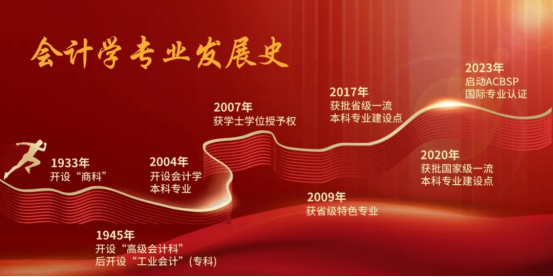 学院早在1945年培华职校时期就开设了“高级会计科”,经过长期的建设和改革,获得了社会普遍认可并享有较高社会声誉。2007年最早获得“管理学学士学位授予权”;2009年获批“省级特色专业”建设项目;2010年获批“省级重点扶持专业”建设项目;2017年获批“省级一流专业”建设项目;2020年获批“双万计划”国家级一流本科专业建设点;2023年成为ACBSP商科专业认证会员,持续推进专业认证工作。