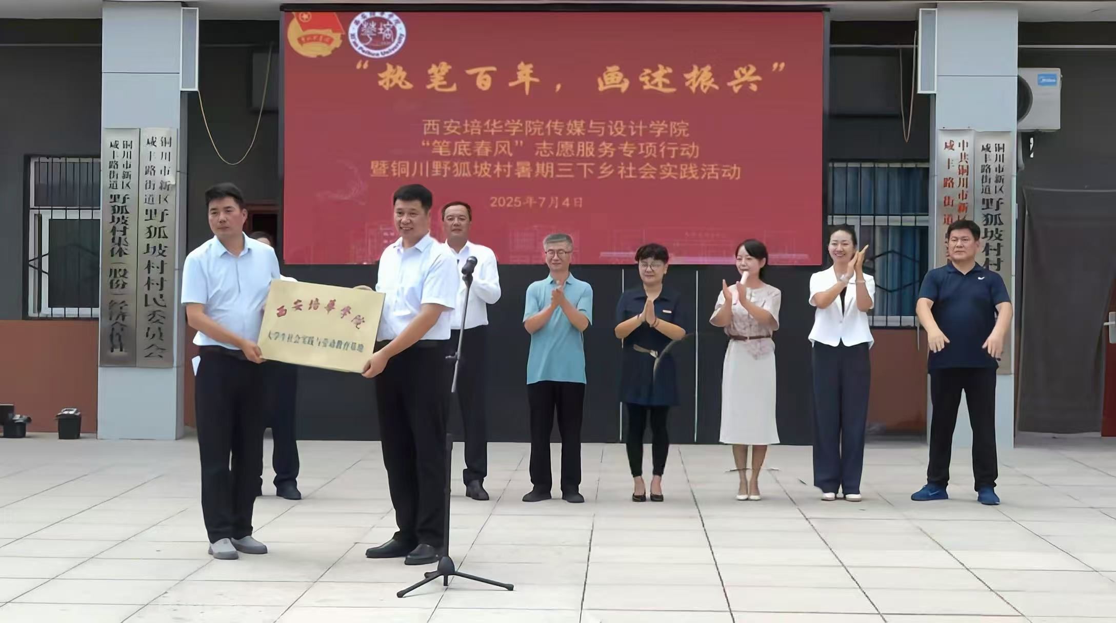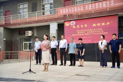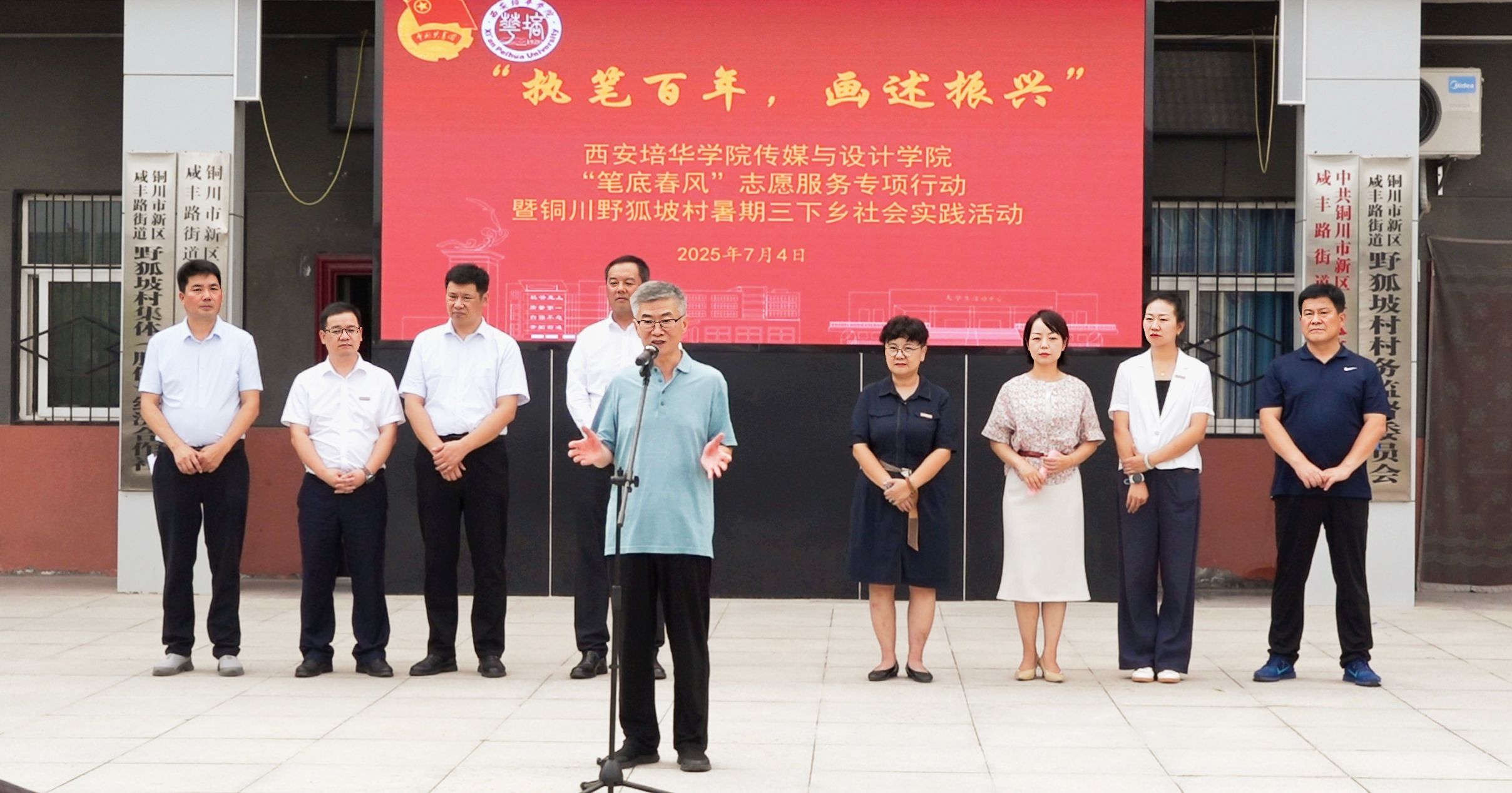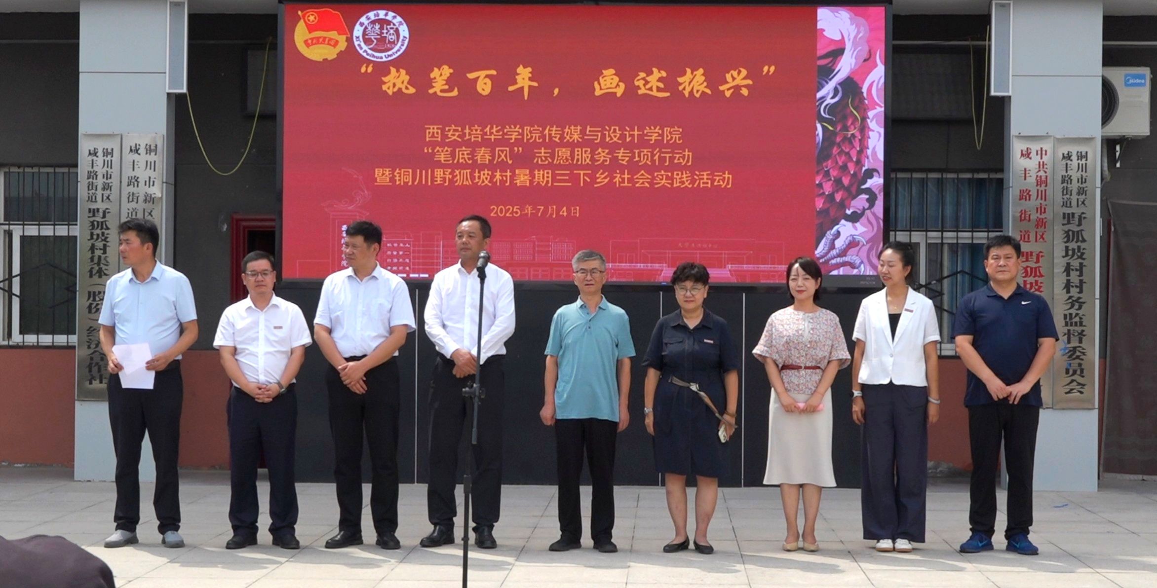7月4日,“执笔百年?画述振兴”,西安培华学院传媒与设计学院“笔底春风”志愿服务专项行动暨“笔底春风”铜川野狐坡村暑期三下乡社会实践活动在铜川市耀州新区野狐坡村拉开帷幕。出席启动仪式的领导有:共青团铜川市委书记郭洁,铜川市新区管委会党工委书记任秦川,新区管委会党工委委员、副主任刘争伟,新区管委会党政办主任、四级调研员任文军,新区管委会党政办副主任、咸丰路街道党委副书记郭嘉宇,咸丰路街道野狐坡村党总支书记、村委会主任宋双峰,西安培华学院党委书记刘锋、副书记蔡亮,传媒与设计学院常务副院长徐莹、党委书记王飞,校团委书记董莹等指导教师。