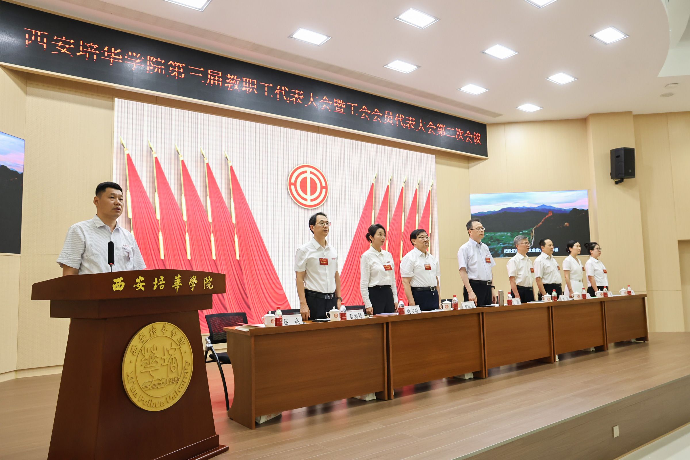 7月9日,西安培华学院第三届教职工代表大会暨工会会员代表大会第二次会议在长安校区明德楼报告厅召开。校领导、工会委员会委员、正式代表、列席人员及特邀嘉宾共130余人参加此次会议。会议由校党委副书记、工会副主席蔡亮主持。