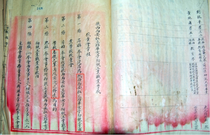 培华女职校董会章程中记录学校名称,“培华”,意在强调“基础之巩固,前途之发展”的办学理念