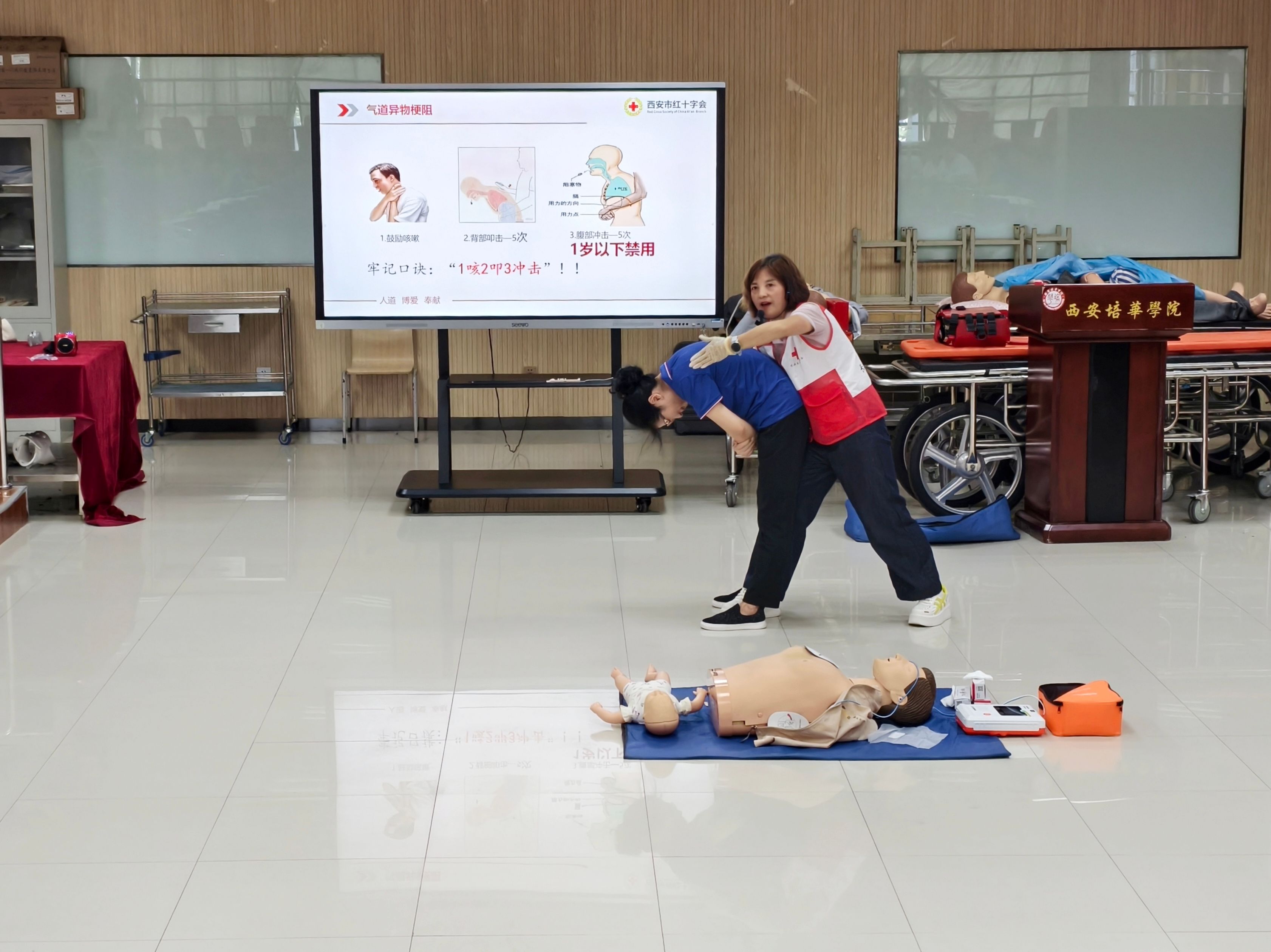 为筑牢学生社区安全防线,保障学生突发身体状况时能得到及时救助,学生社区特邀西安市红十字会为公寓管理员及后勤工作人员开展了“应急救护培训”。培训采用“理论讲解+情景模拟”模式,重点教授了应对呼吸骤停(心肺复苏术CPR)、昏厥抽搐及气道异物梗阻(海姆立克急救法)的标准操作流程。管理员们认真进行情景模拟练习,操作规范流畅,培训效果显著。鼎晟物业培华项目部经理庞磊强调,公寓管理员是校园安全的重要守护者,此次培训不仅传授了技能,更强化了“第一响应人”意识。