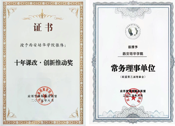 十年来,学校不断总结经验,荣获多项荣誉,多个项目荣获陕西省高等教育教学成果奖,其中“转型发展高校应用型课程改革探索与实践”等项目荣获一等奖。同时,应用型课程改革受到应用型课程建设联盟认可。学校自2019年起蝉联应用型课程建设联盟常务理事单位,2020年斩获课程改革创新奖,2024年智能学院荣膺创新团队奖。我校唐明、王菊宁、分别荣获2020课改年度教师,2022、2024课程建设年度教师奖。同时,学校14名教师受聘为应用型课程建设联盟讲师团成员。