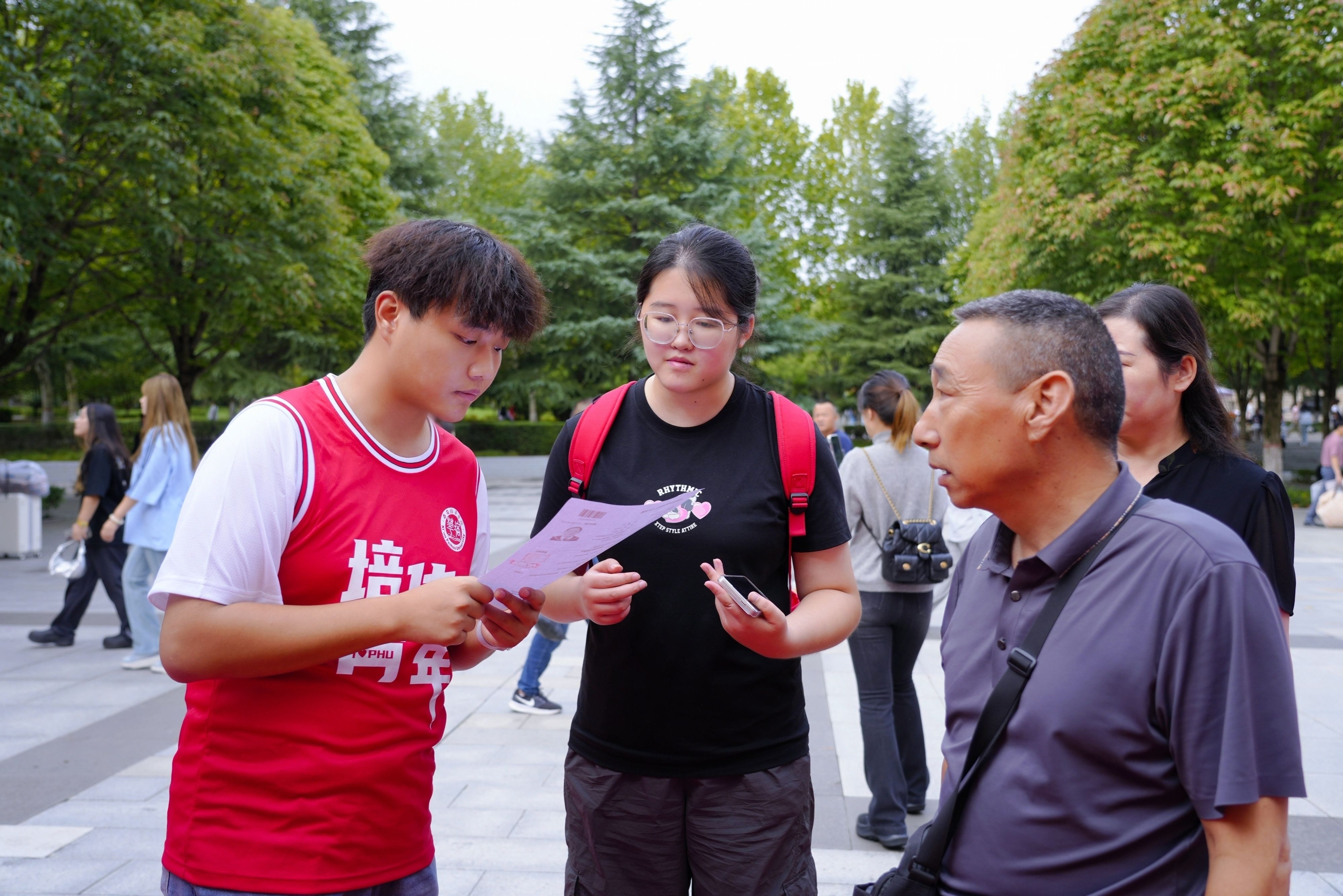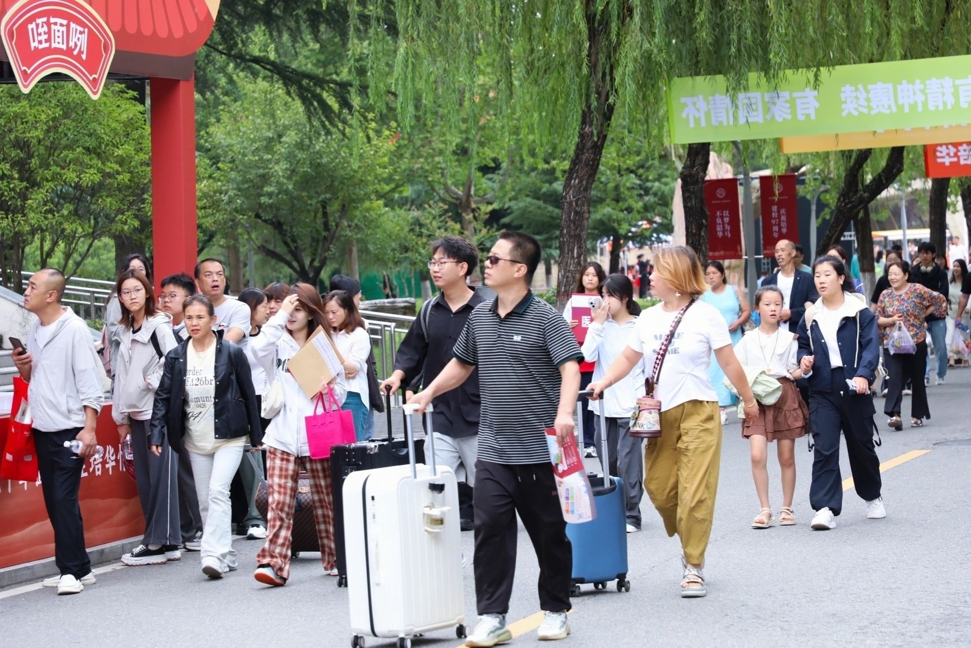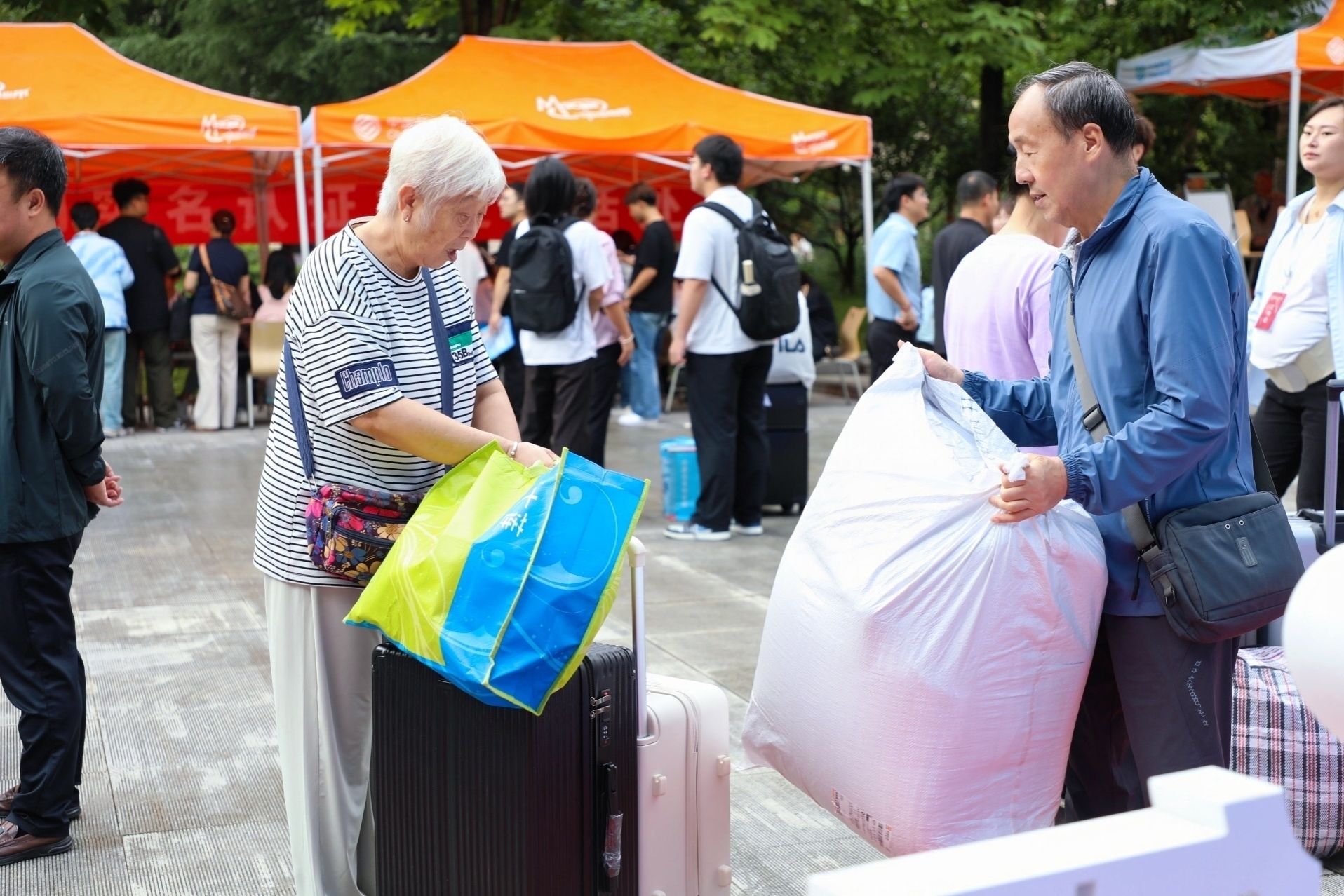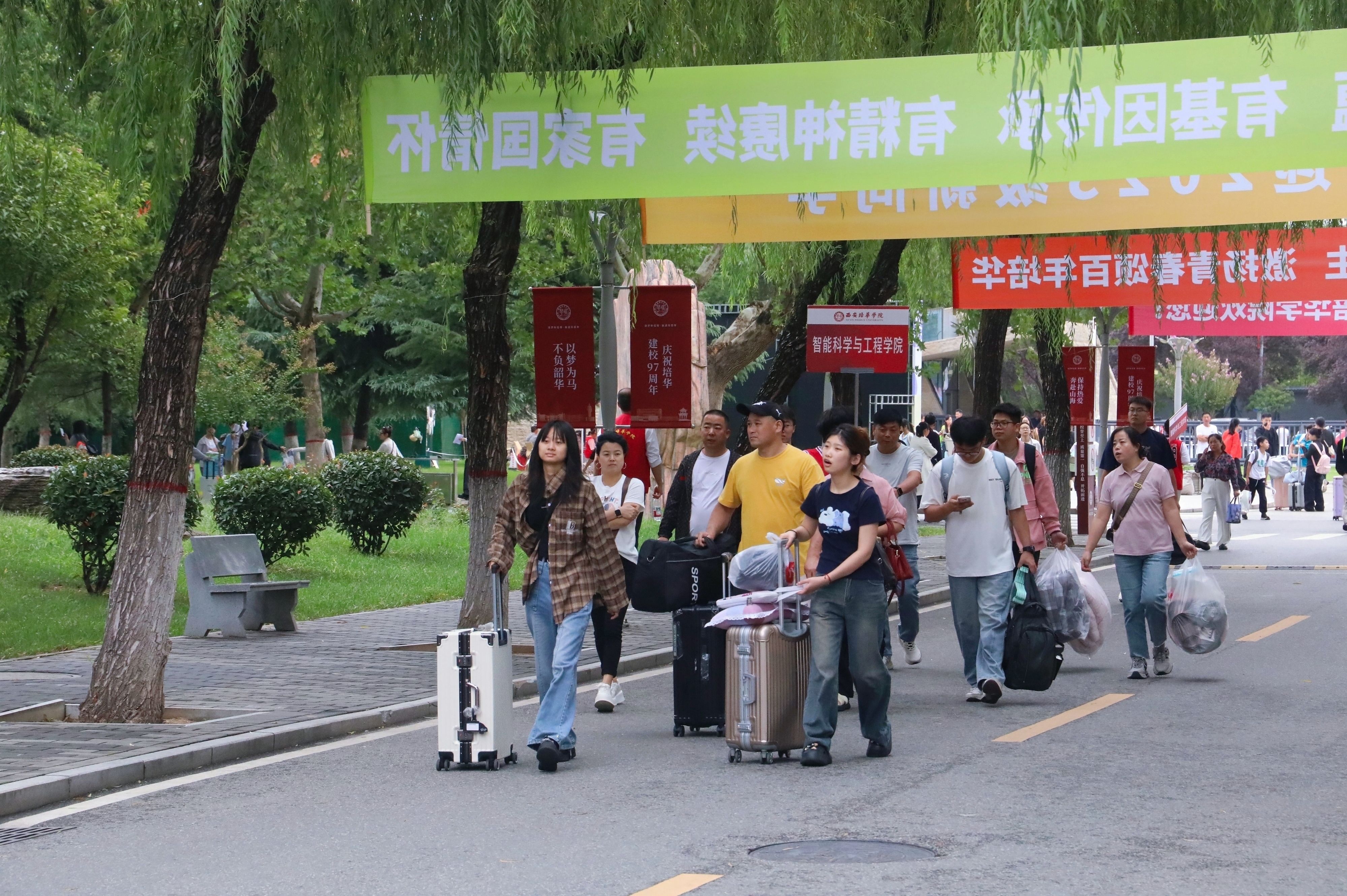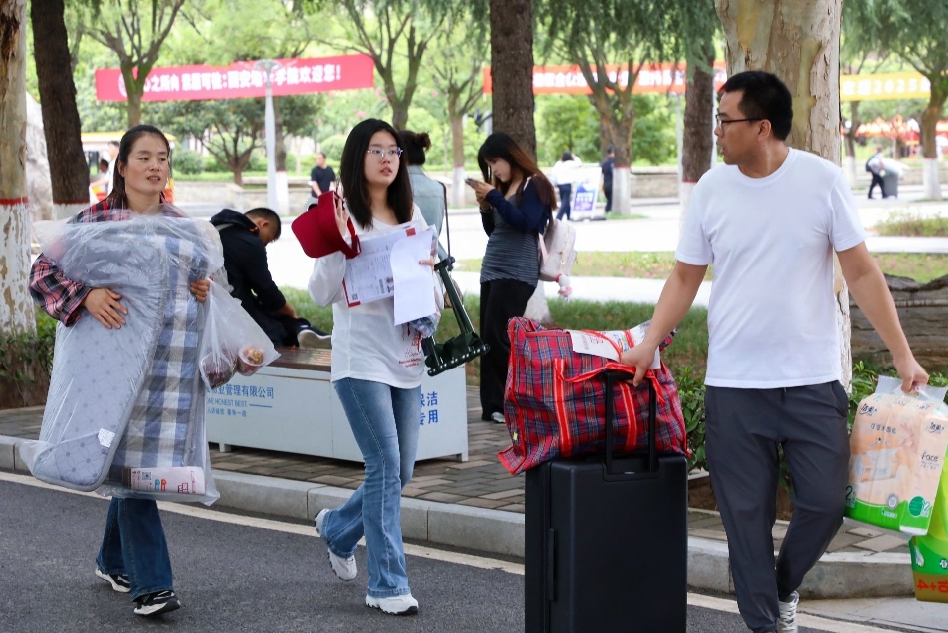 校园里随处可见家长陪伴新生的身影,他们细心帮着孩子提行李。沉甸甸的行囊里,装着的不仅是生活用品,更是家人浓浓的关爱与不舍。