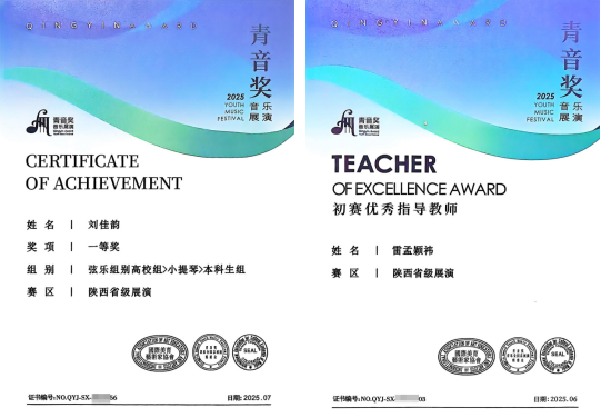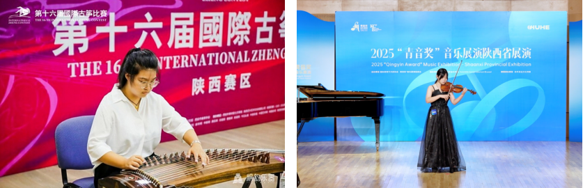 近日,由国际美育艺术家协会与“青音奖”音乐展演全国总展演组委会举办的2025“青音奖”音乐展演,及由香港中外文化艺术交流协会、陕西秦筝苑与西安市秦筝协会举办的第十六届国际古筝比赛在西安举办。西安培华学院艺术教育中心教师雷孟颖祎带领大学生艺术团成员刘佳韵、康有庆组队参赛,最终荣获小提琴高校组一等奖和古筝高校组银奖的优异成绩。雷孟颖祎老师也因出色的指导工作,被授予“优秀指导教师”称号。