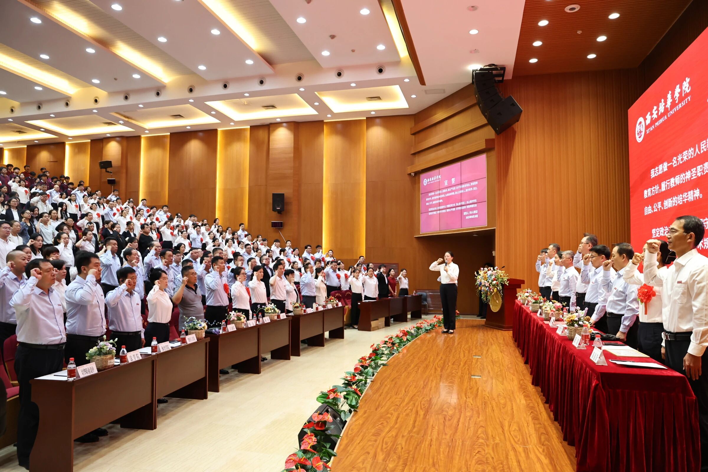 9月10日上午,西安培华学院在维之图书馆报告厅举行2025年庆祝教师节暨表彰大会。全体校领导,学校各院(部)、中心负责同志,国家和省级教学赛事获奖代表,高水平科研成果获得者,2024-2025学年优秀教师、先进工作者、师德先进、“四有”好老师获得者,以及教师代表,学生代表等400余人参加了大会,学校理事长姜波博士到会并讲话。会议由传媒与设计学院教师甘辉杰、张笑影主持。
