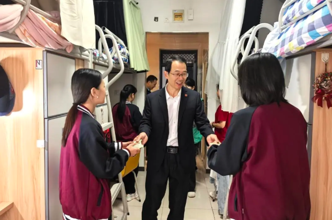 “同学们,中秋节快乐!”“学习还顺利吗?”“生活上有什么需要随时告诉我们!”每到一处,他们都与同学们亲切交谈。一句句家常话,瞬间拉近了距离。接过月饼的瞬间,不少同学笑着说:“感觉像收到了家人的关怀。”