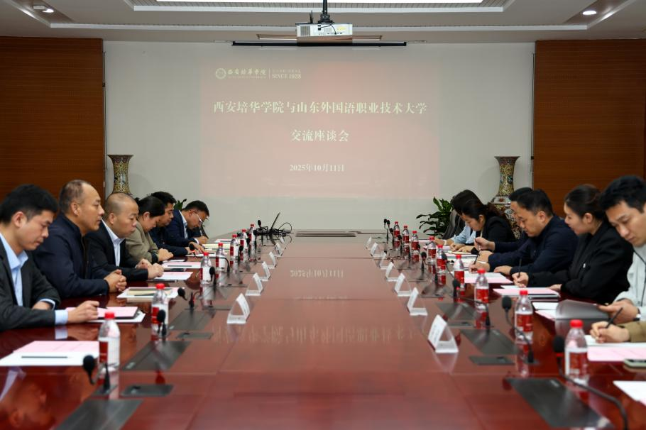 10月11日下午,山东外国语职业技术大学后勤处处长王勇、学生处处长蒋博率队一行9人来校开展后勤服务与学生管理工作交流座谈。西安培华学院后勤服务中心主任张静远、学生服务中心副主任杨媛及相关部门人员陪同参观。