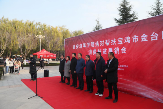 12月8日上午,西安培华学院结对帮扶宝鸡市金台区消费扶贫展销会在学校图书馆广场举行。金台区扶贫办主任陈卫东,农业农村局局长王立权,教体局副局长陈雅琴,新农产业联合会会长刘延平等亲临现场指导。学校党委书记罗新远,校扶贫办、工会及各院(部)、中心主要负责同志参加了仪式。学校师生代表、后勤人员、商户等300多人参加了活动。活动由学校监事会主席、党委副书记徐国富主持。