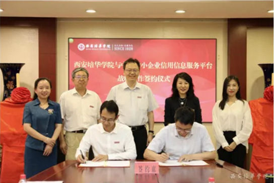 西安培华学院与中国中小企业信用信息服务平台战略合作签约仪式在我校举行,姜波理事长与中国中小企业协会姜海欧副会长为合作基地揭牌。