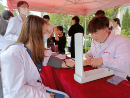 南丁格尔志愿服务队的同学们在综合楼西广场设置血压测量点。