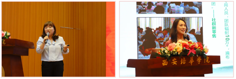 蓝田县特色产业发展中心干部、西安市女大学生创业联盟秘书长刘燕作题为《一名大学生村官的坚守与梦想》的报告,讲述了她从村党支部书记助理到村党支部书记,从扶贫干部到民政办主任,坚守梦想、扎根基层,带领村民脱贫的经历;紫阳三生科技有限公司董事长、陕西省“双带”致富青年先进个人林红梅以《巾帼梦 三生幸》为题,讲述了她在带领农户脱贫致富的路上,创出紫阳模式,在振兴乡村的理想中,搭建平台开发新产品的过程。