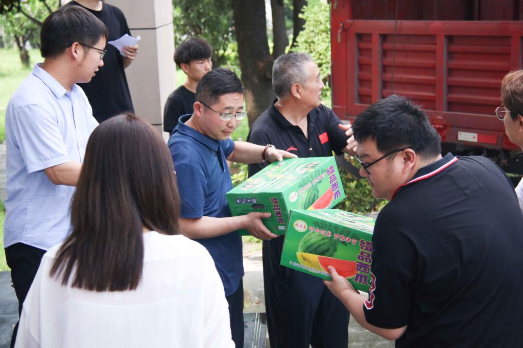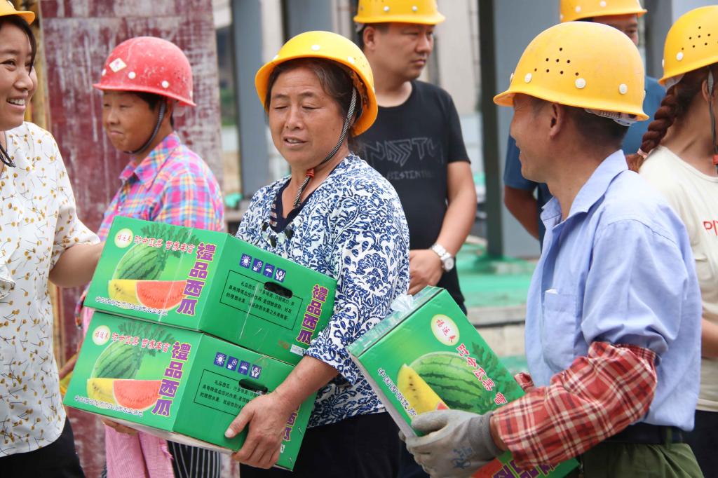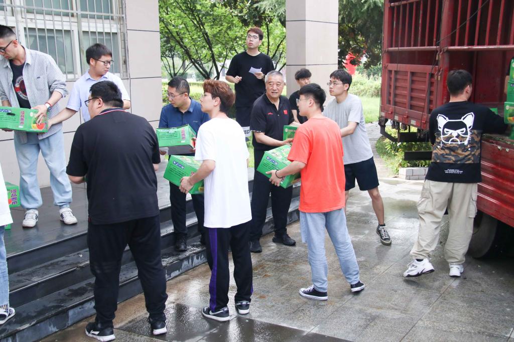 校长助理姜涛将400余斤西瓜等降温物资,送到了奋战在高温一线的基建人员手中,向他们表达祝福和感谢,并叮嘱工人时刻牢记高温季节施工安全注意事项,防止安全事故和高温中暑事件发生,确保人身安全。
