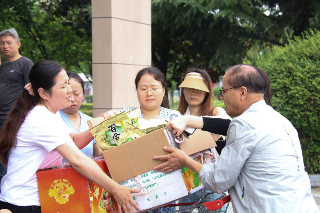 西安培华学院监事会、工会主席徐国富为教职工发放清凉礼包。