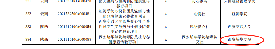 学校《西安培华学院禁毒防艾社青春健康宣传教育项目》被评为A类级别