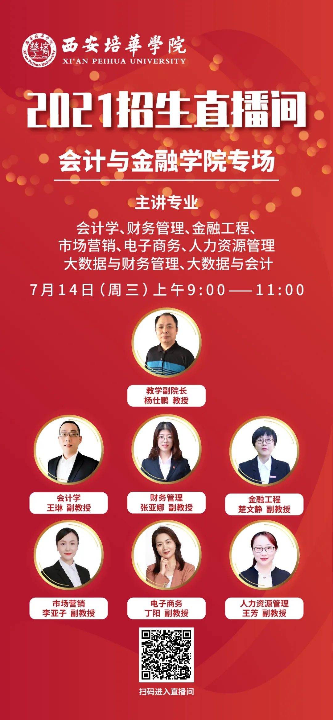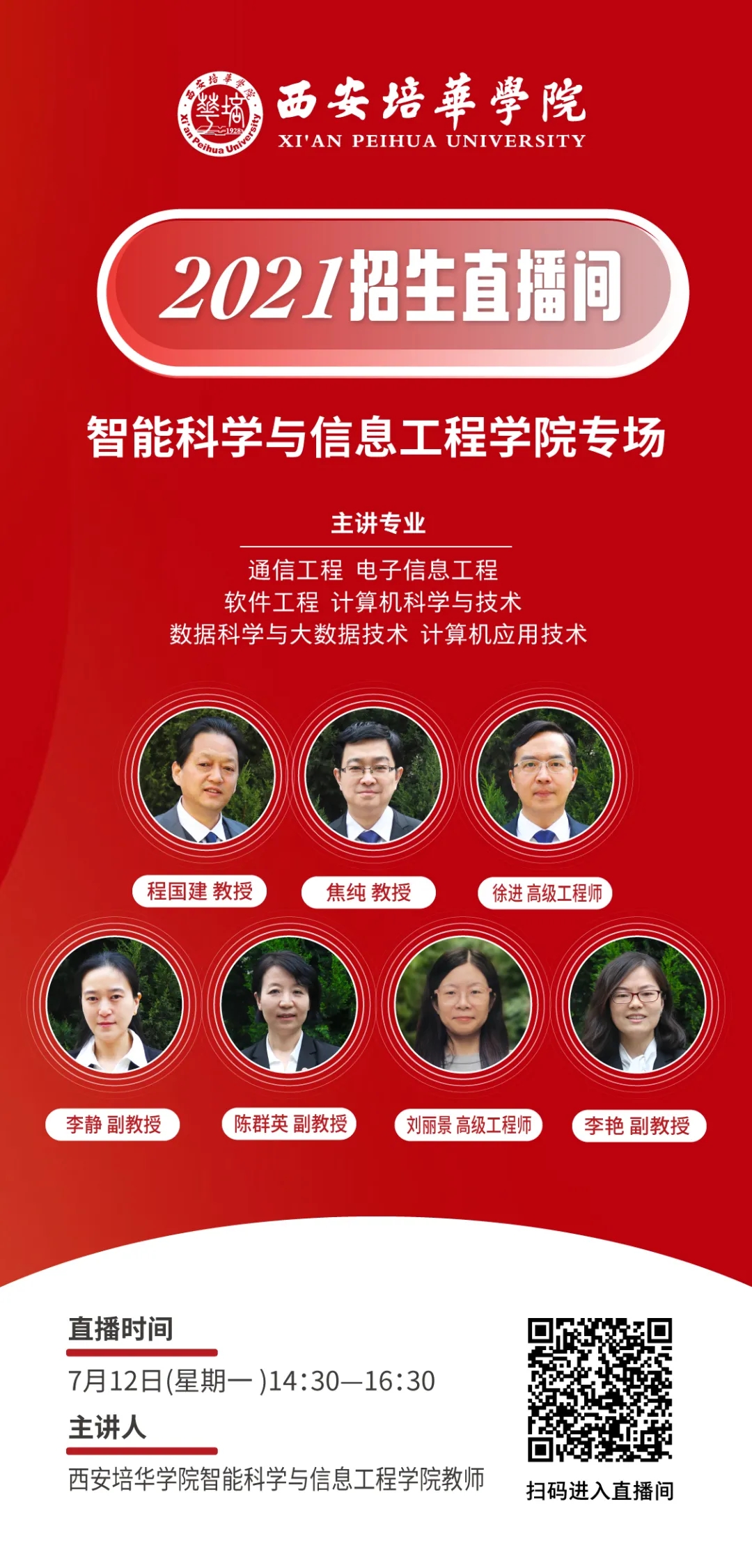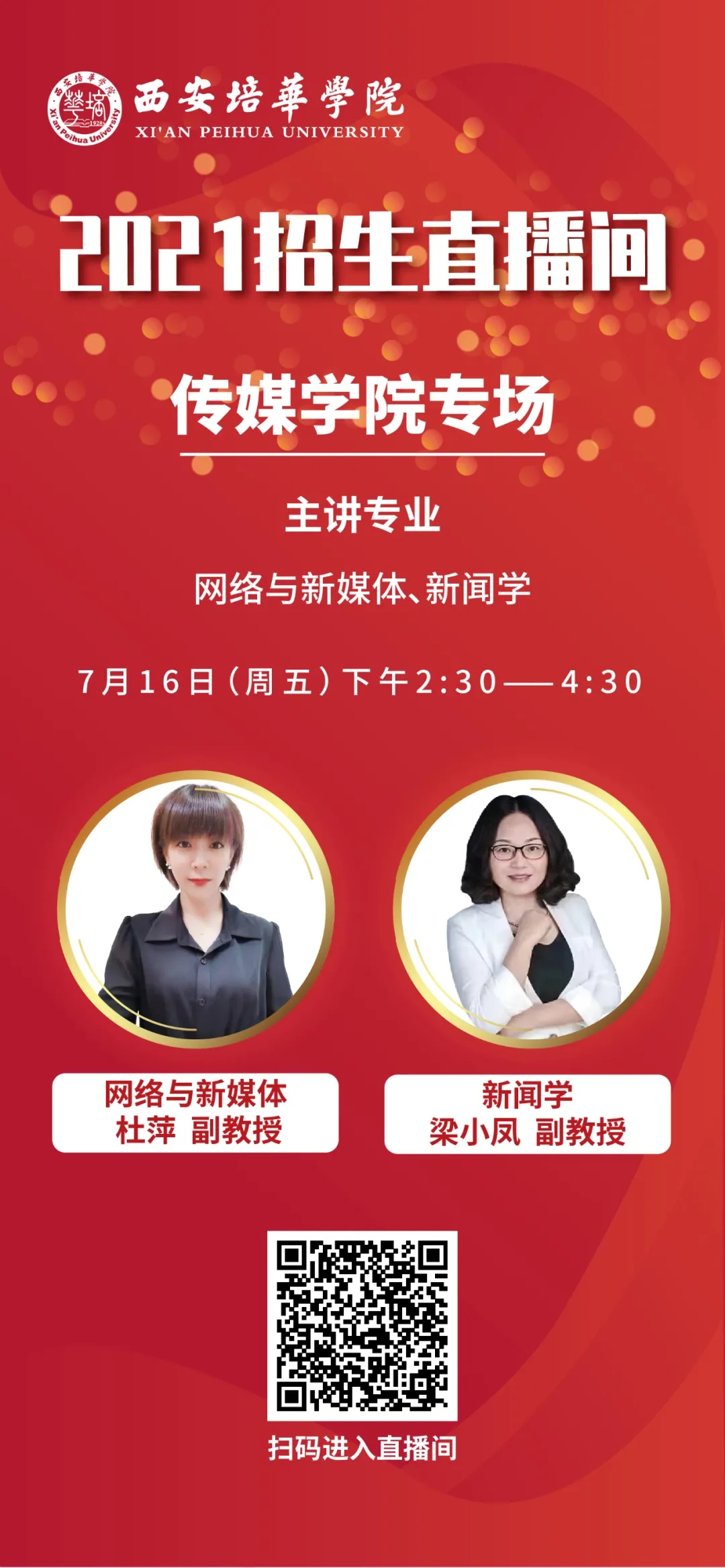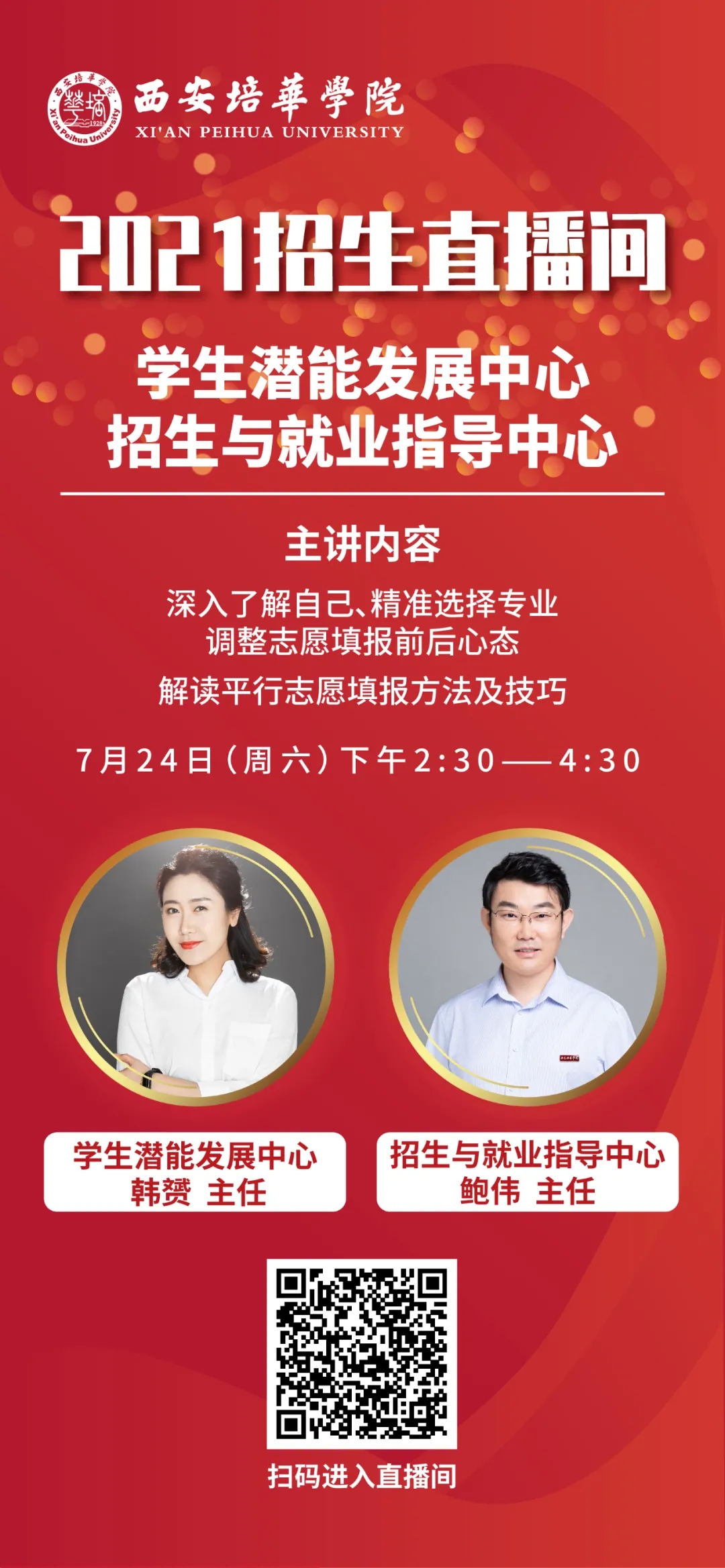 为方便广大考生,7月12日起,西安培华学院准备了招生宣传系列直播,内容涵盖高考志愿填报指导、西安培华学院招生政策解读、专业介绍等,扫描下方二维码即可观看精彩内容。