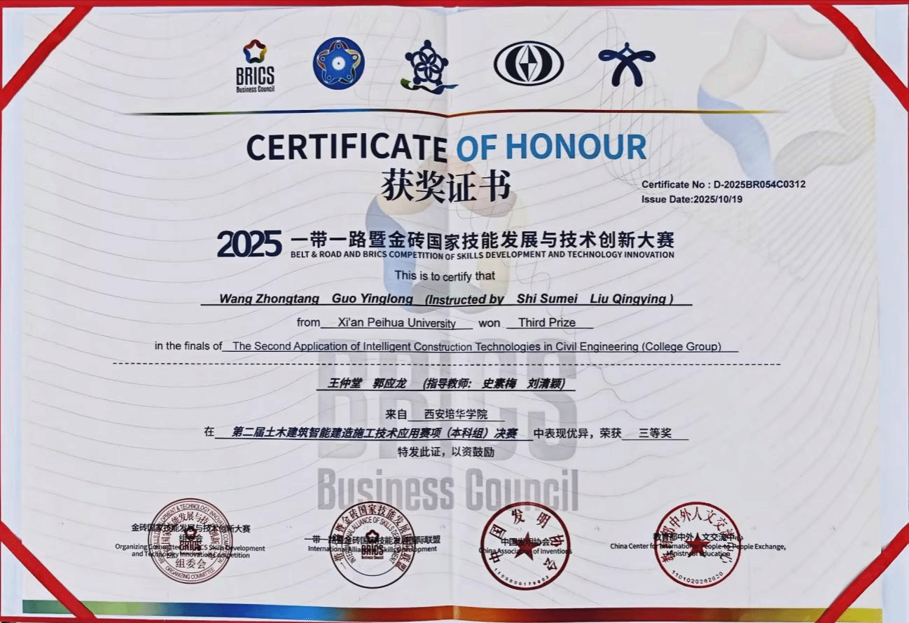 2025年10月17日至19日,2025“一带一路”暨金砖国家技能发展与技术创新大赛之第二届土木建筑智能建造施工技术应用赛项决赛圆满落幕。作为金砖大赛平台的核心赛项之一,本次赛事通过技能对话与创新交流,在规模与维度上实现了双重突破。西安培华学院智能科学与工程学院参赛队伍表现卓越,在全国决赛中荣获三等奖1项,区域赛中斩获一等奖1项、二等奖1项。