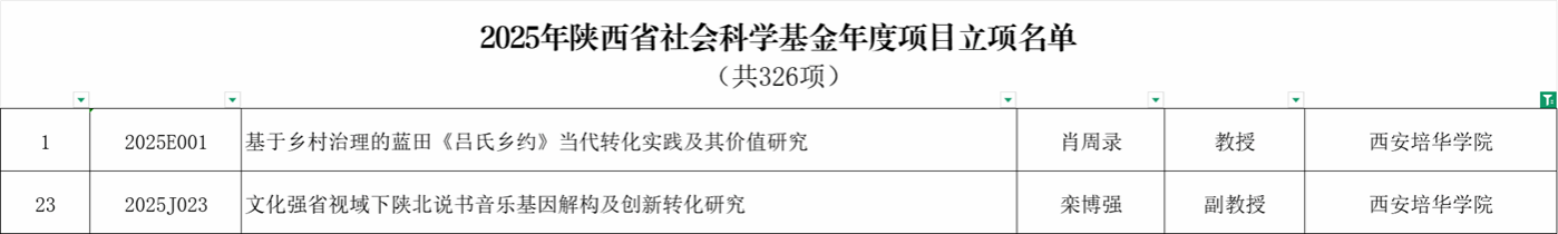 近日,陕西省哲学社会科学工作办公室正式发布《关于2025年陕西省社会科学基金年度项目和“青博”项目立项有关事项的通知》,西安培华学院申报的两项课题成功获批立项。此次立项标志着学校在哲学社会科学领域的研究实力与服务地方文化发展的能力得到了权威认可。