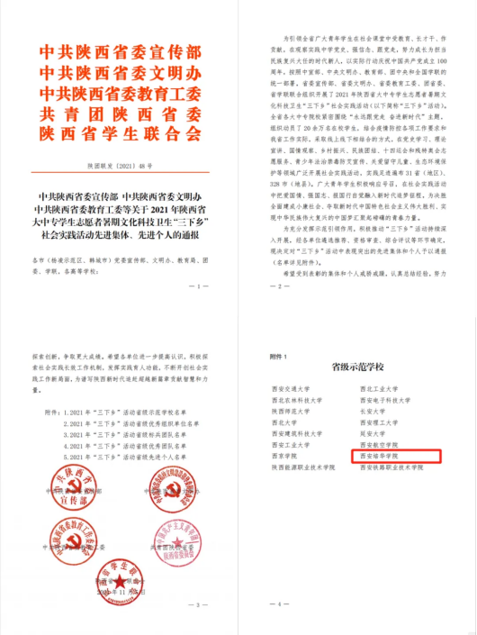 近日,中共陕西省委宣传部、中共陕西省委文明办、中共陕西省委教育工委、共青团陕西省委、陕西省学生联合会共同下发《关于2021年陕西省大中专学生志愿者暑期文化科技卫生“三下乡”社会实践活动先进集体、先进个人的通报》(陕团联发〔2021〕48号)文件。