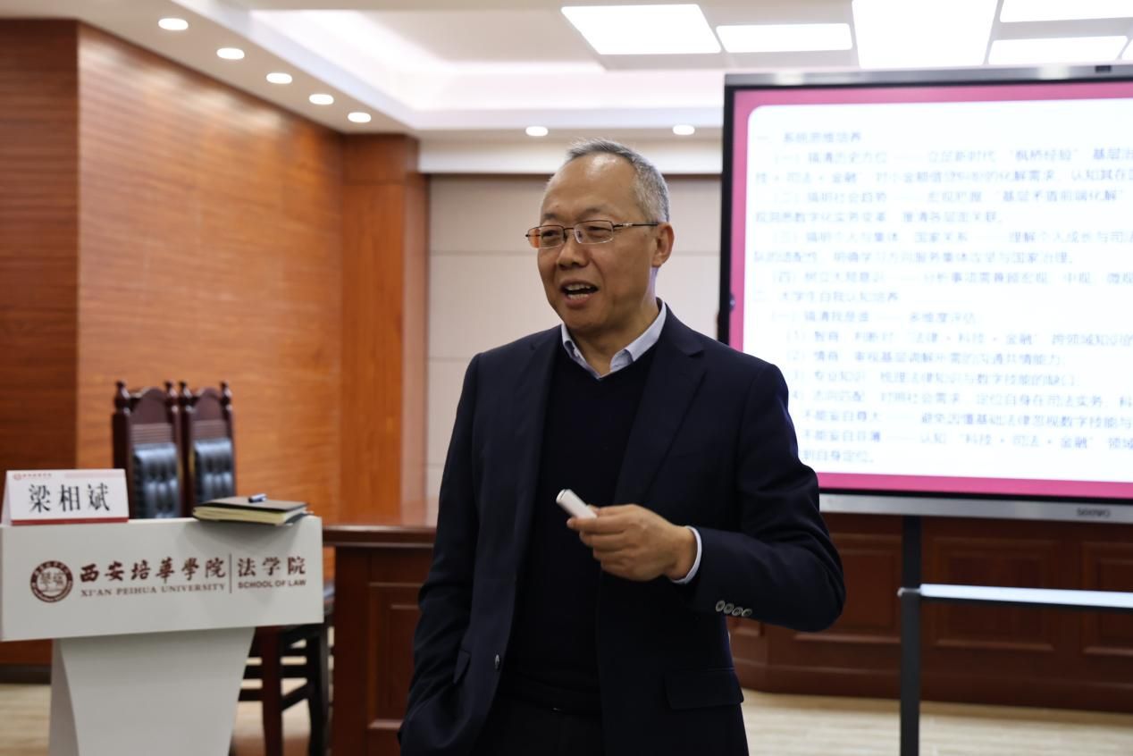为了深入学习贯彻党的二十届四中全会精神,全面落实“十五五”规划关于法治建设的决策部署,切实提升师生法治素养与理论水平,2025年12月8日下午,在法学院模拟法庭,西安培华学院特聘教授梁相斌以“新时代‘枫桥经验’重塑中国社会基层治理模式——兼论大学法治人才培养方向”为题,深入分享了对基层治理创新与法治人才培养的独到见解。讲座由学校常务副校长胡俊生主持,法学院领导班子成员及部分师生共同参与。
