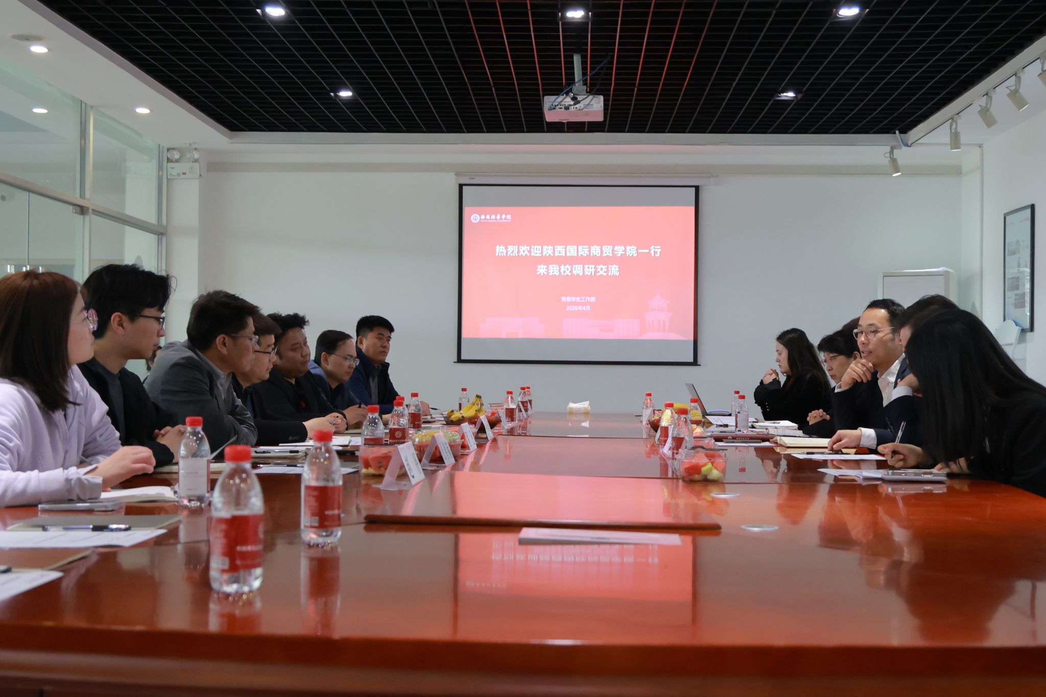 为交流经验、提升学生工作管理能力,优化学生工作管理措施,完善学生工作管理制度。4月3日下午,陕西国际商贸学院学生工作处处长刘亚锋一行来校调研交流。西安培华学院党委学工部部长权勇太、副部长王飞,招生与就业指导中心副主任王琳,文学院行政副院长南兵,“雏鹰”工作室主持人郝甜甜,“智”心无涯工作室主持人高珊珊等在汇知楼第四会议室接待了来访嘉宾一行。