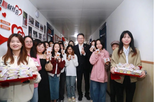 理事长姜波为同学们发放月饼