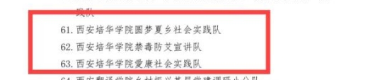 西安培华学院再次获得“陕西省示范院校”荣誉称号(民办院校唯一获评该项荣誉);圆梦夏乡社会实践队(人文与国际教育学院)、禁毒防艾宣讲队(青年志愿者联合会)、爱康社会实践队(医学院)3支队伍获得“陕西省社会实践优秀团队”荣誉称号;马肖老师(医学院团委书记)、闫星慧(传媒学院新闻学2021级学生)、崔刚奇(会计与金融学院会计学2021级学生)3人获评“陕西省三下乡社会实践先进个人”;《基于BIM技术在陕西不同地势的农村区域排水以及污水处理的调研》(建筑与艺术设计学院 指导教师:郝甜甜、段晓晓、坚强)获评为“陕西省三下乡社会实践优秀调研报告”。