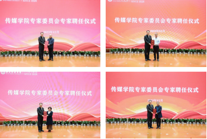 理事长姜波为西北大学文学院教授、博士生导师、陕西省教学名师张阿利,西安邮电大学数字艺术学院院长、教授、陕西省教学名师闫兴亚,大赢家棋牌播音指导、节目主持人陈爱美,西安外国语大学新闻与传播学院院长、教授、博士生导师黄建友颁发聘书。