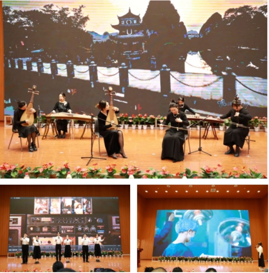 活动现场,传媒学院教师带来民乐合奏《通天大道宽又阔》,播音与艺术专业学生带来了朗诵《献给每一个你》、配音表演《中国共产党》等。