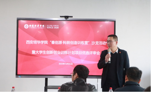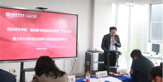 12月6日,西安培华学院“秦创原·科转创造训练营”第一期沙龙活动暨大学生创新创业训练计划项目优选评审会在创客中心举办。陕西省科技资源统筹中心创新创业与科技金融服务部科长唐照霄、苏陕东西部合作发展促进会产业发展专委会主任郭金栗、陕西维一信息技术有限公司总经理孙英等三位专家受邀担任评委。活动由创客中心负责人王旭东主持。