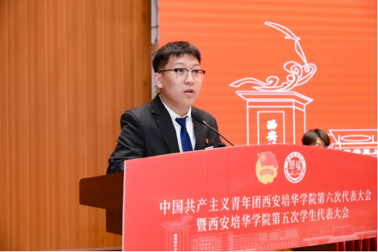 员泽阳同学代表西安培华学院第四届学生会主席团作了题为《为高举中国特色社会主义伟大旗帜踔厉奋发,勇毅前行为把我校建设成为高水平的一流民办大学而团结奋斗》的工作报告,报告中将近年来学生会的成绩和改革经验进行了汇报,同时从“筑牢信念之基、深化机制改革、创新服务水平”等几个方面对未来工作进行展望。