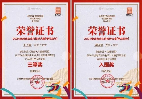 近日,由2024全球吉庆生肖设计大赛(甲辰龙年)获奖作品公布。西安培华学院设计创新中心主任王子健老师作品《龙出水:文创滤茶器》获得产品设计单元三等奖;2021级视觉传达设计专业蔺欣怡同学作品《龙腾千里》获得平面设计单元入围奖。