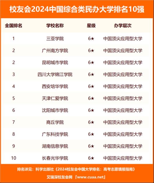 2024年1月17日,全国第三方大学评价机构艾瑞深校友会网(Cuaa.Net)正式发布《2024校友会中国大学排名:高考志愿填报指南》。其中,西安培华学院在校友会2024中国民办大学排名Ⅱ类中,位居前5强。